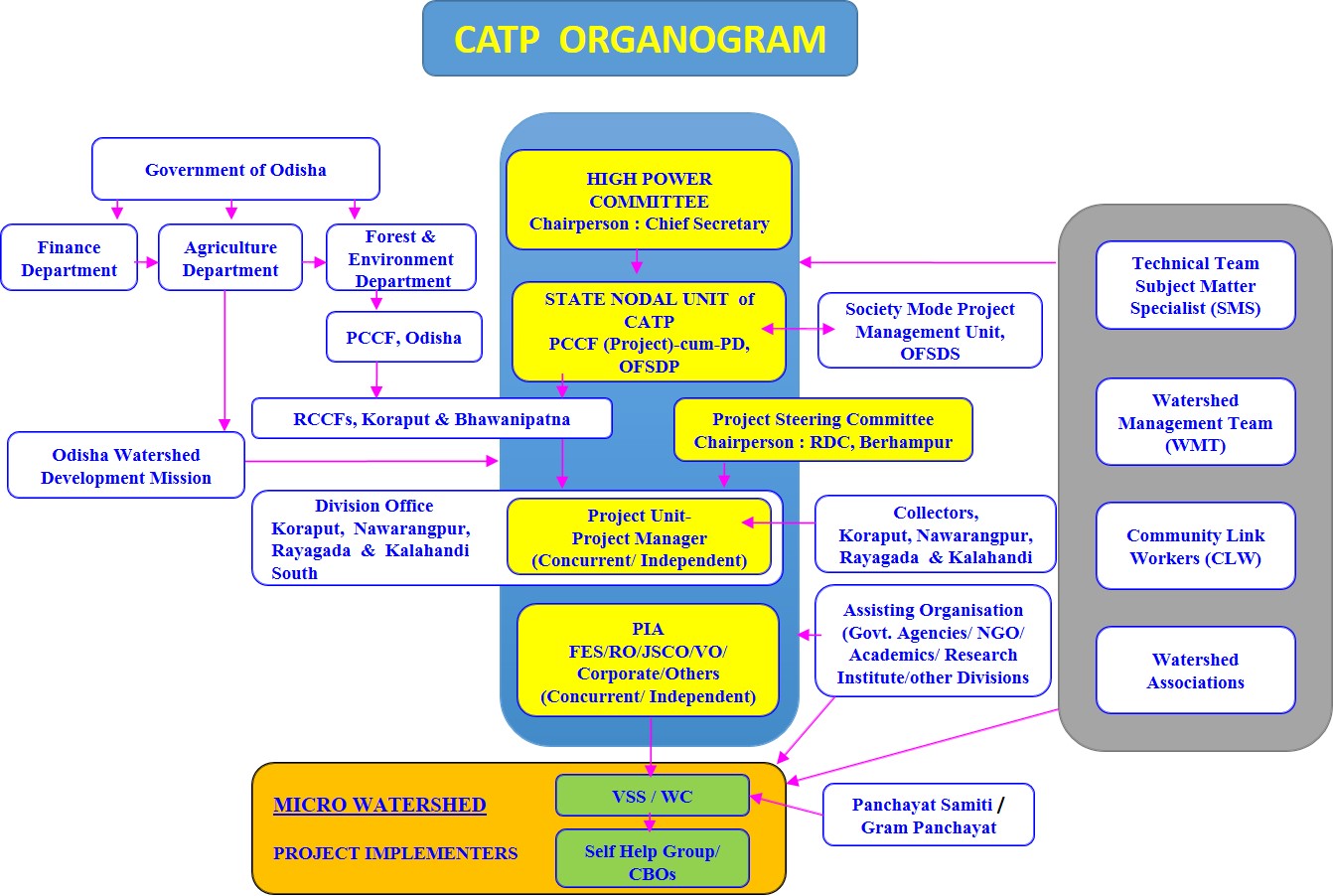 Project Manager (DFO Rank) with two Asst. Project Managers and 4 Subject Matter Specialists with support staff looks after the implementation of the programme at the project level.