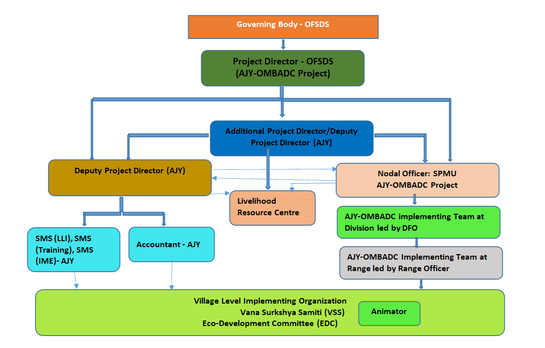 The Project is being implemented under the Odisha Forestry Sector Development Society(OFSDS), the registered society under the Societies Registration Act, 1860, having registration number 2323/49 of 2006-07. The Principal CCF(Projects) and Project Director, OFSDP who is also the ex-officio Chief Executive Officer (CEO) of OFSDS, is the Project Director of the AJY Livelihood Project, OFSDS-OMBADC. The Governing Body of OFSDS will be the highest decision-making body of AJY Livelihood Project, Funded by OMBADC. The State Project Management Unit (SPMU) of AJY-OMBADC will implement proposed project activities following project cycle, implementation schedule, and annual action plan and envisaged processes. In Division level, the project will be implemented through the same field institutional frame of Division, Range and VSS as the AJY project is being implemented. Resource organizations would be engaged from time to time by the SPMU of AJY-OMBADC to support the Divisions, Product Clusters and the Ranges. The Project have mandate to engage Animators at the VSS level to support the VSS in implementing the project at the community level.